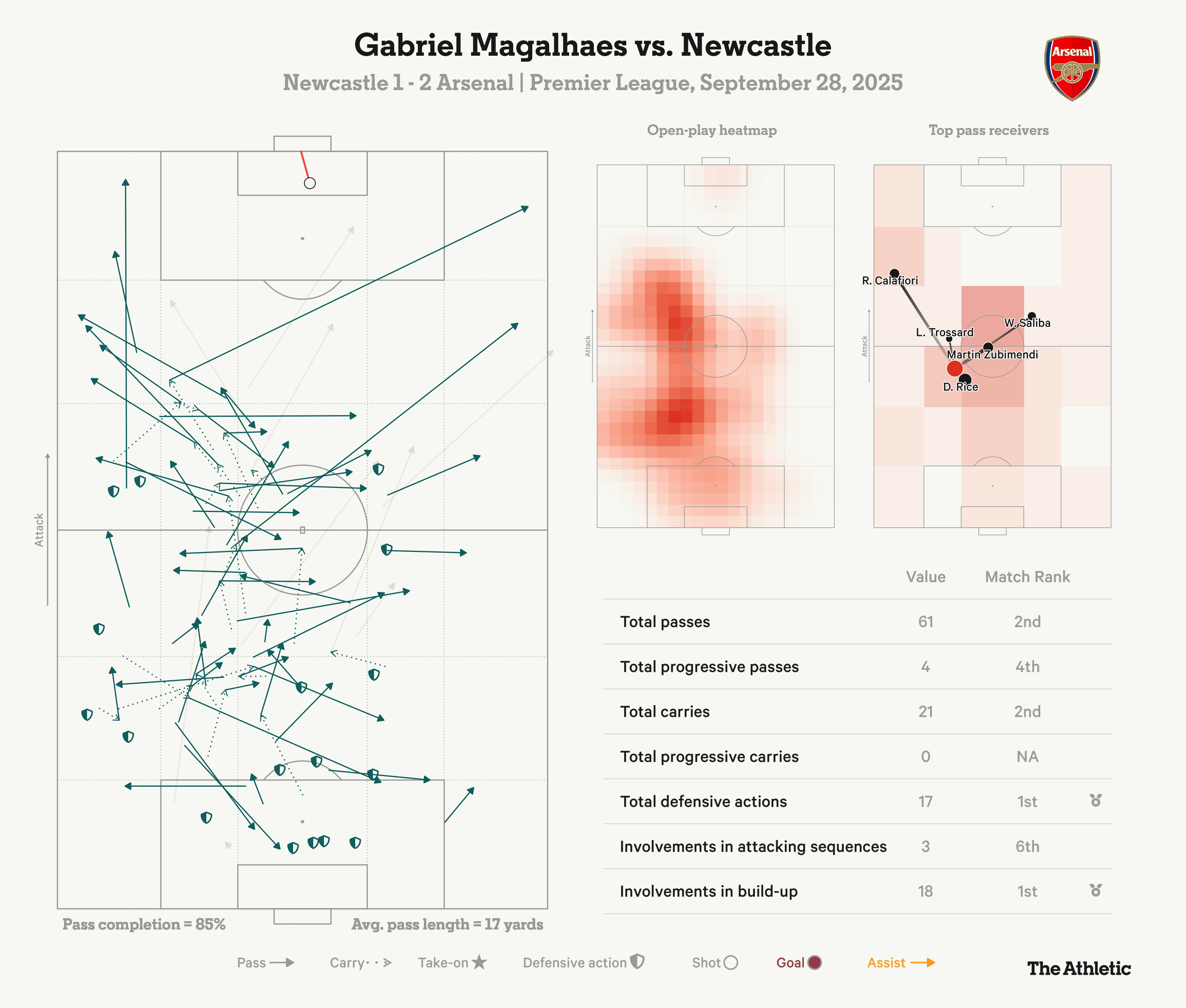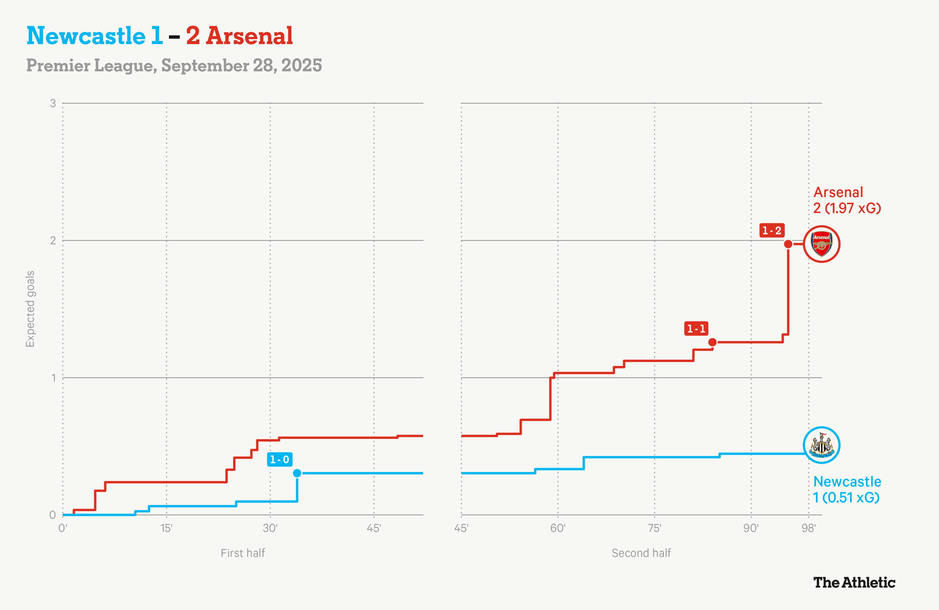 What an experience that must have been for Gabriel. The 27-year-old was unquestionably at fault for Newcastle’s opener, falling easily at a light touch from Woltemade, but stood up when it counted most, deep in added time.