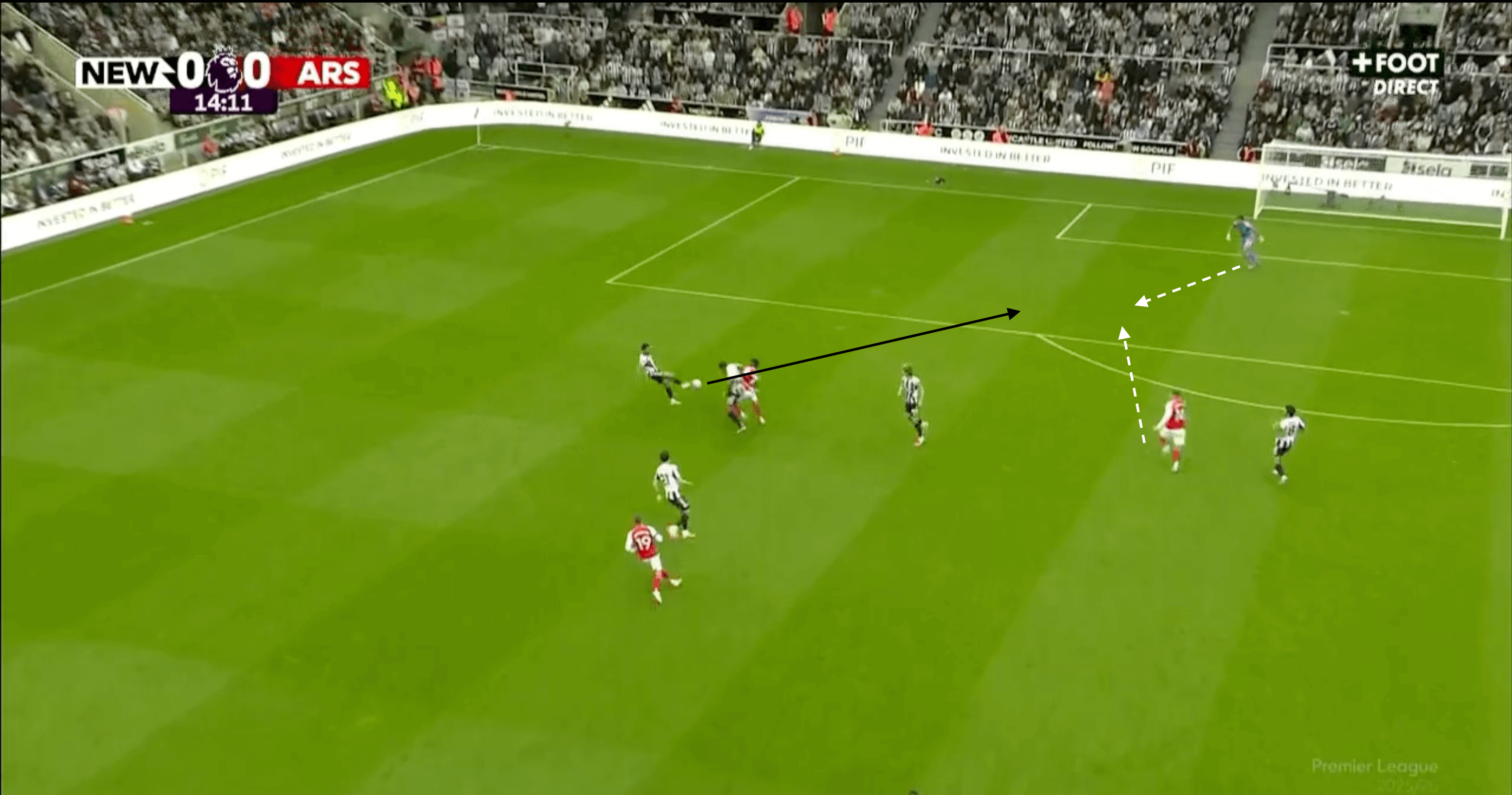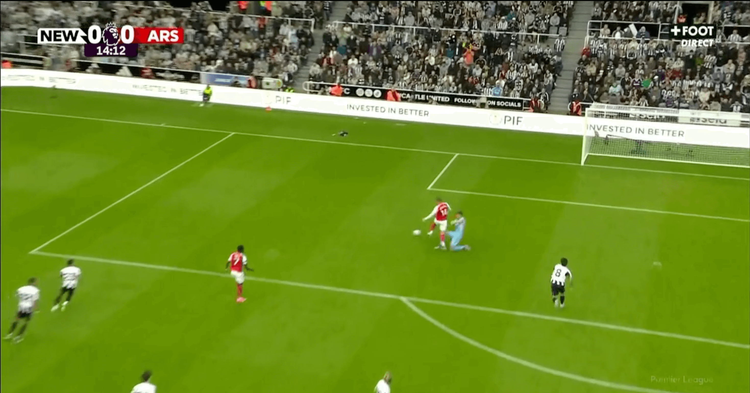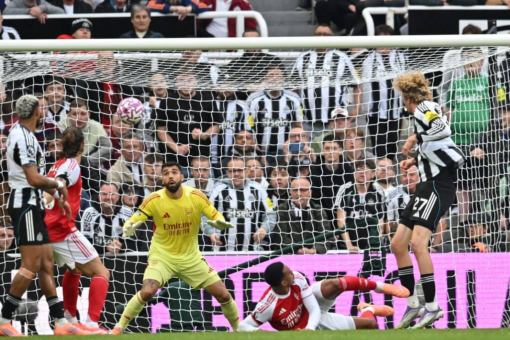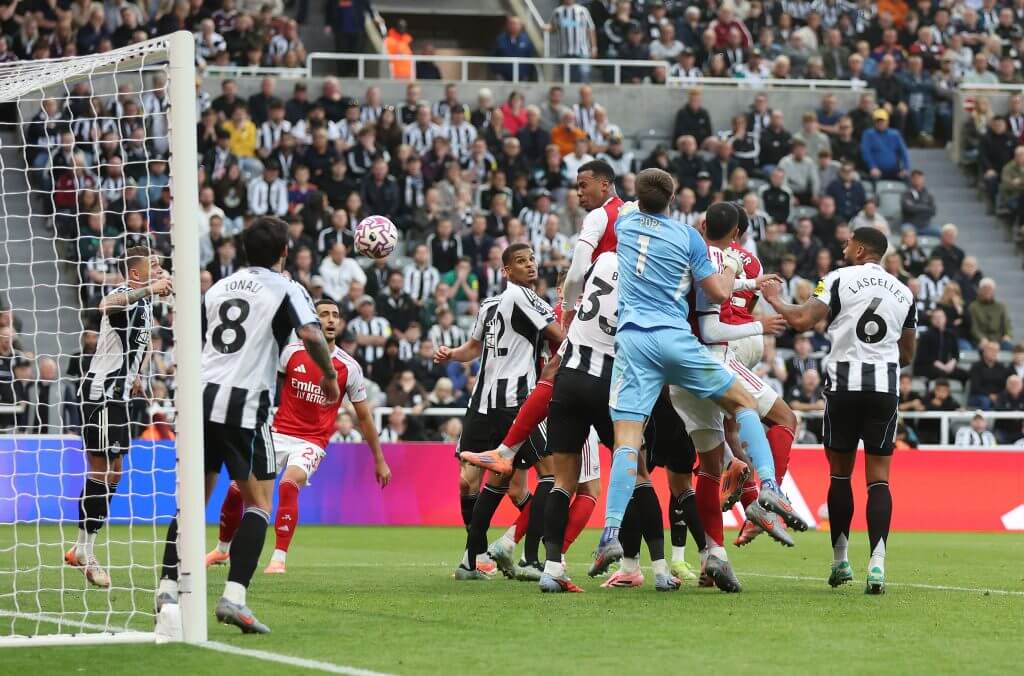 Following a home corner, Gabriel dispossessed Bruno Guimaraes. Arsenal then attacked, with Eze playing a long ball into Bukayo Saka down the middle. Saka was stopped by a combination of Anthony Gordon and Malick Thiaw, with the ball falling to Jacob Murphy, who played a weak backpass towards Pope.