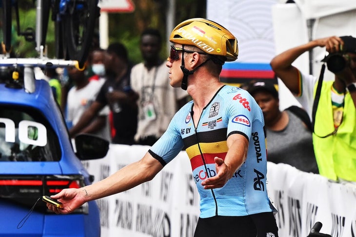 Evenepoel vents frustration in spectacular fashion as he suffers costly slow bike change at Rwanda road worlds: ‘l felt like I was in excellent shape.’