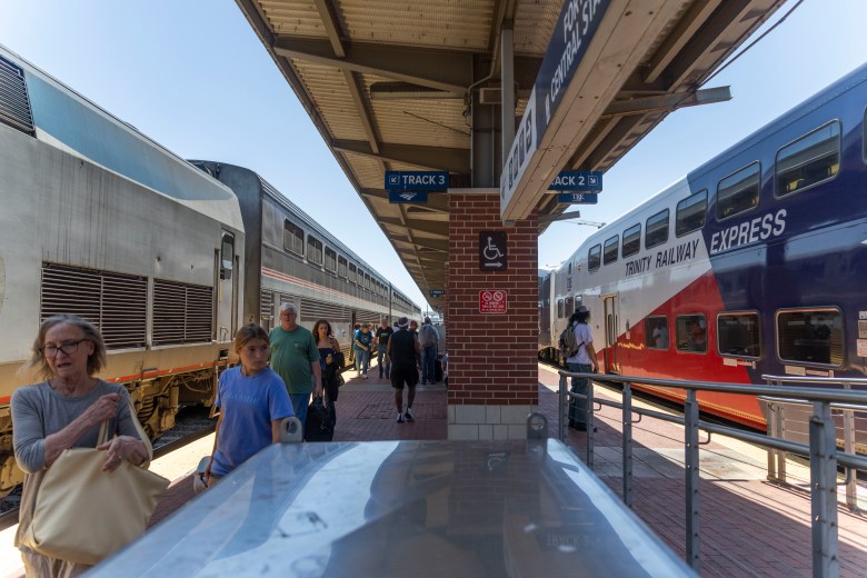 Passengers walk around the platform July 21, 2025, at the Trinity Metro Central Station in downtown Fort Worth. (Mary Abby Goss | Fort Worth Report)