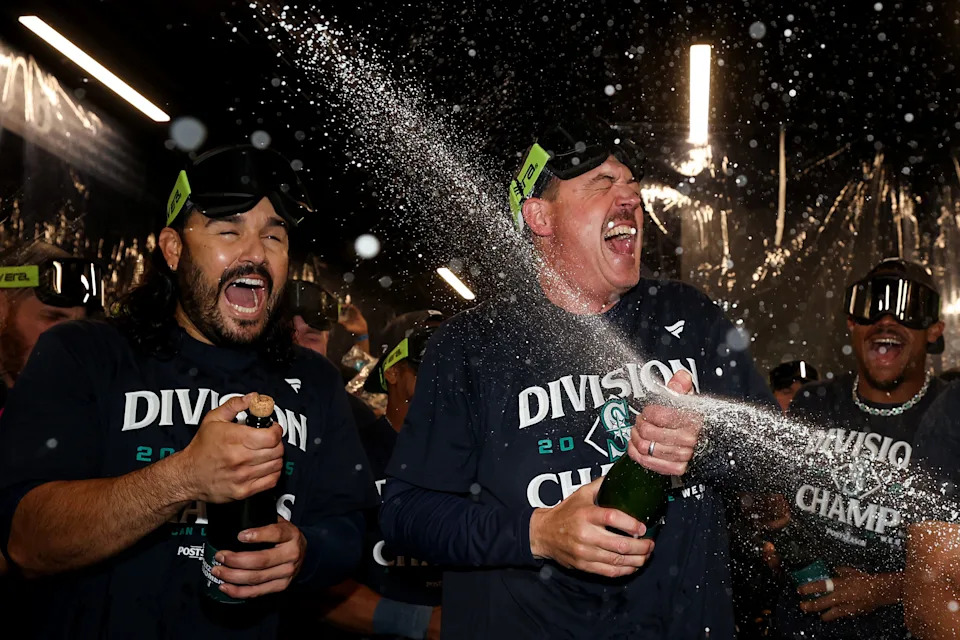 Seattle Mariners outfielder Randy Arozarena douses catcher Cal Raleigh after winning the AL West division title with a win over the Colorado Rockies at T-Mobile Park in Seattle on Sept. 24, 2025.