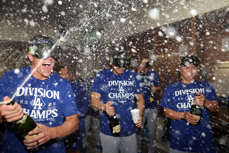The Los Angeles Dodgers celebrates in the locker room after winning the National League West title after a game against the Arizona Diamondbacks at Chase Field on Sept. 25, 2025.