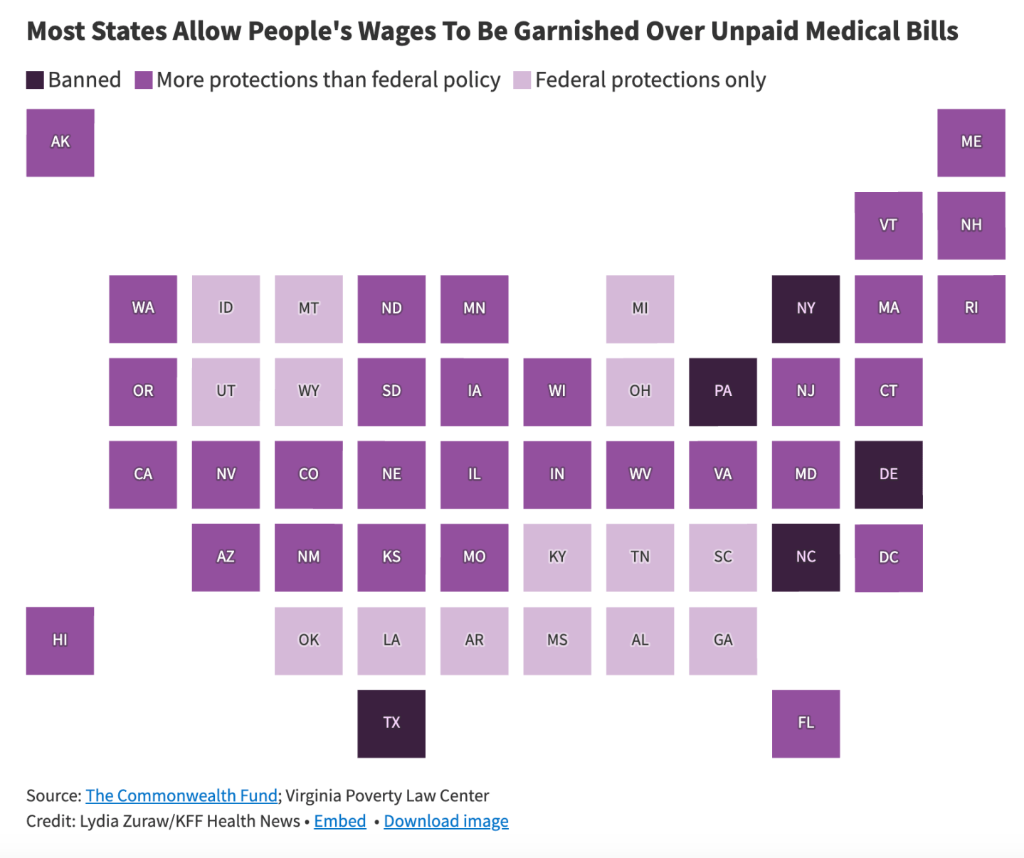 Colorado has company. It is one of 45 states that allow wage garnishment for unpaid medical bills. Only Delaware, New York, North Carolina, Pennsylvania, and Texas have banned wage garnishment for medical debt.