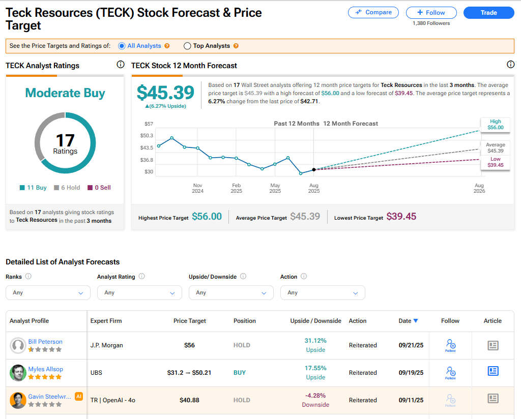 The stock of Teck Resources has a consensus Moderate Buy rating among 17 Wall Street analysts. That rating is based on 11 Buy and six Hold recommendations issued in the last three months. The average TECK price target of $45.39 implies 6.27% upside from current levels.