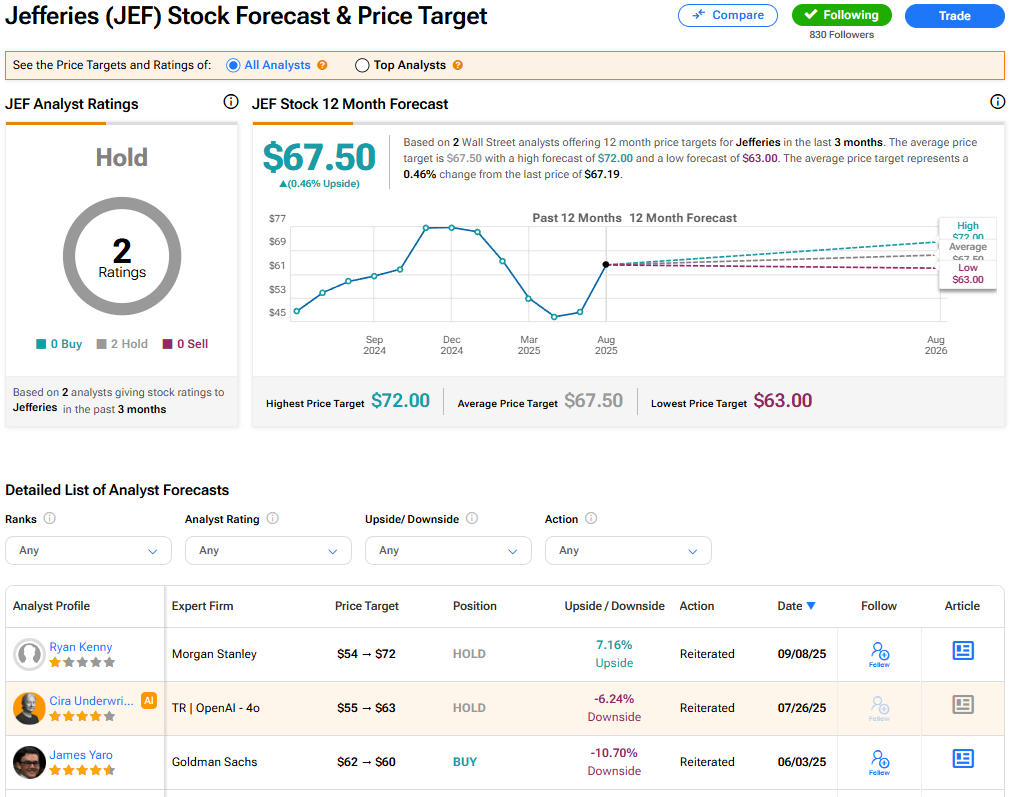 The stock of Jefferies Financial Group has a consensus Hold rating among two Wall Street analysts. That rating is based on two Hold recommendations issued in the last three months. The average JEF price target of $67.50 implies 0.46% upside from current levels. These ratings could change after the company’s financial results.