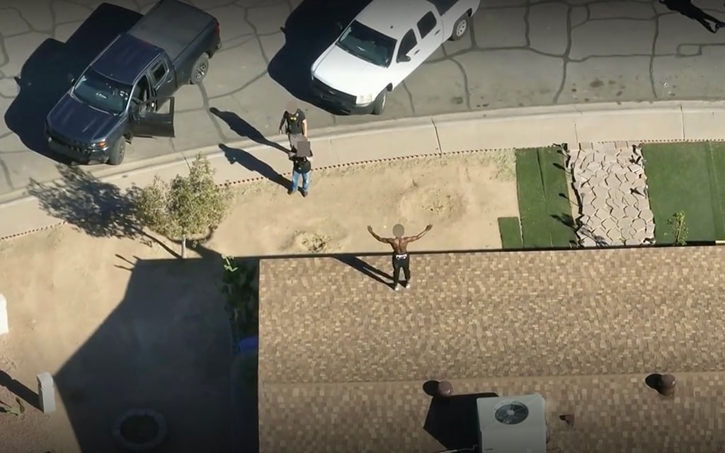 He rolled off the roof, fell to the ground and was surrounded by officers.