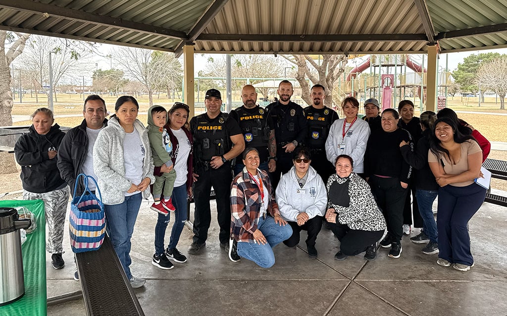Members of Estrella Super Moms Block Watch and Maryvale Estrella Mountain Precinct’s Community Action Squad officers pose for a photo at El Oso Park in Phoenix after discussing community concerns about deportation on Feb. 12, 2025. (Photo courtesy of Rosa Menjivar/Howard Center for Investigative Journalism)
