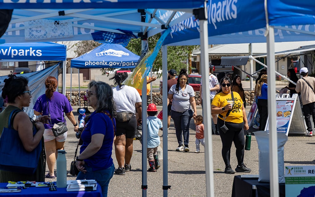 Residents gather at the Maryvale Mercado in front of the Maryvale Community Center to support local businesses on March 29, 2025. (Photo by Owen Alfonso/Howard Center for Investigative Journalism)