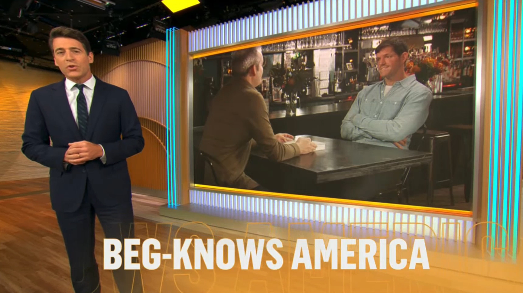 For the top of the second hour, which typically features each anchor teasing a story before joining together in the center of the studio, similar banners are used with an orange gradient added to help boost visibility, which largely replaces the text shown on the video wall imagery behind the anchors the show used during the Times Square era.