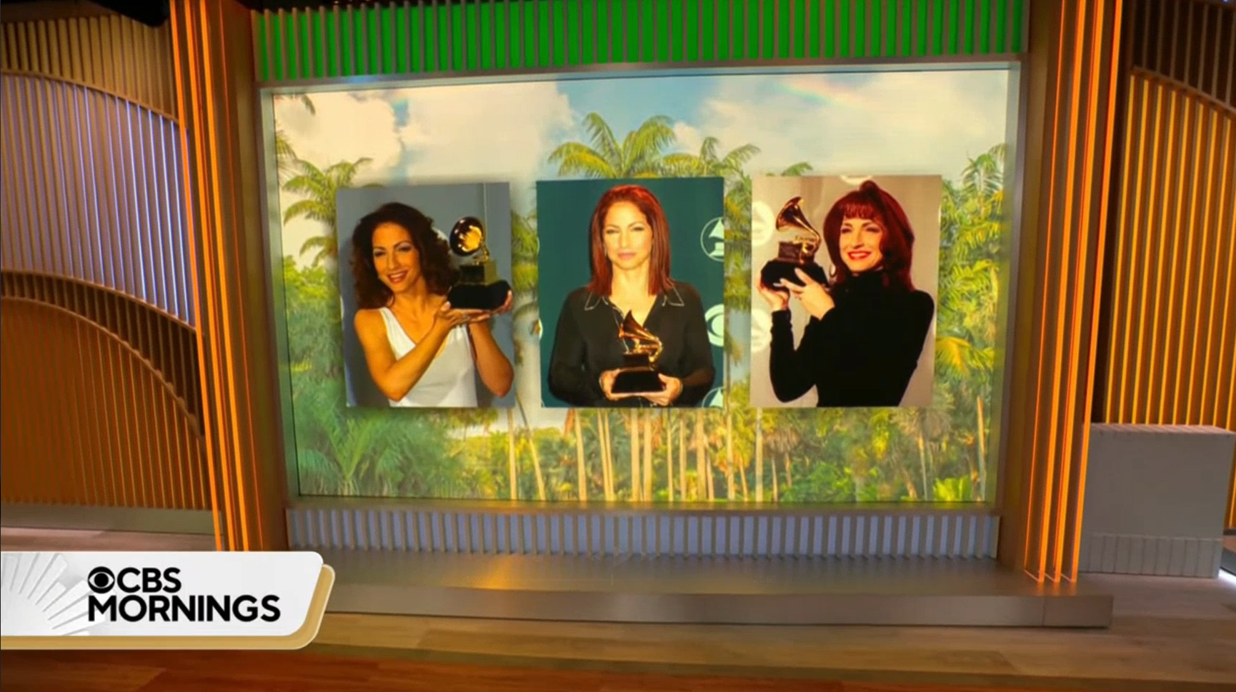 For an interview with singer Gloria Estefan, the broadcast simply filled the three video walls with a tropical background that was, with the exception of the two hard columns, wasn’t interrupted by other effects, text or imagery on top. The result was a clean, elegant look for the segment that was able to match the mood of the subject while also still making the shots feel like they were originating from a studio.