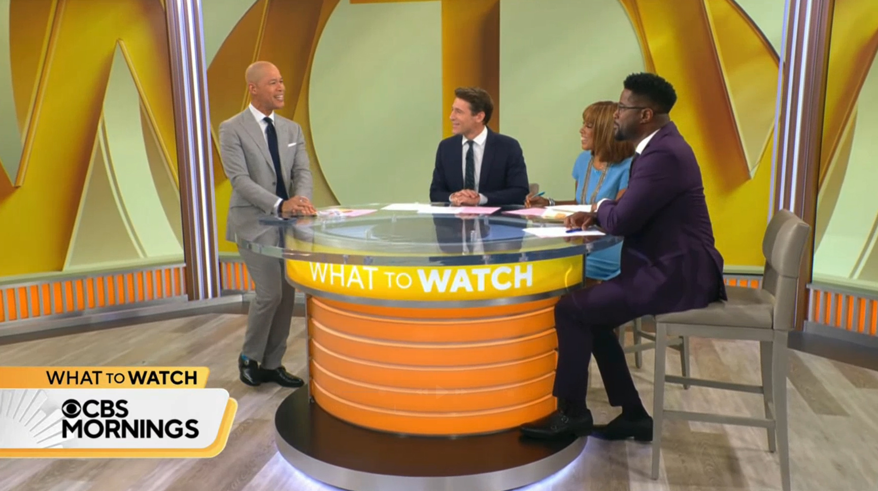 During “What to Watch,” for example, the three-segment wall behind the secondary desk features the shapes created by giant renditions of the segment’s name along with portions of the CBS eye.