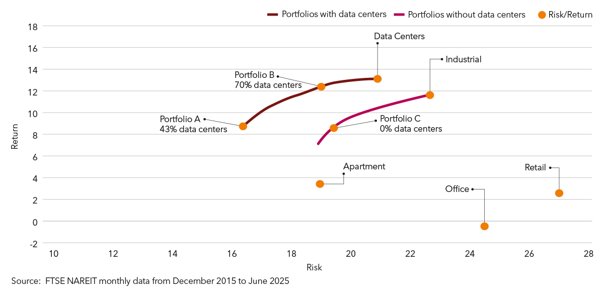 How does allocating to data centers affect the overall risk-return profile of an investment portfolio?