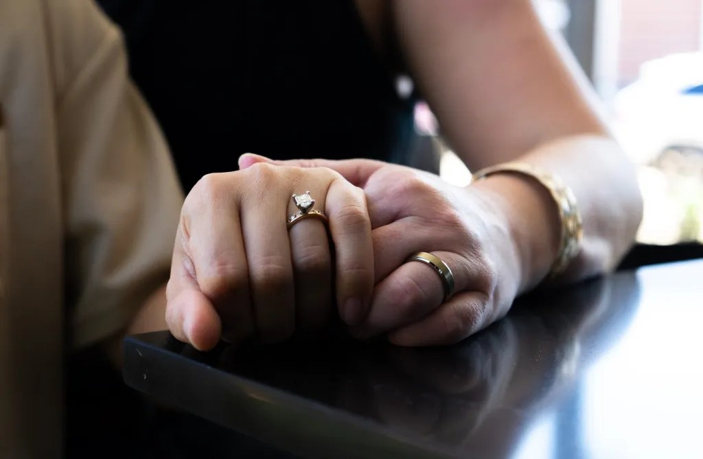 April and Shaina Dreyson hold hands with wedding bands on their ring fingers in Southlake Sept. 23, 2025. (David Moreno | Fort Worth Report)