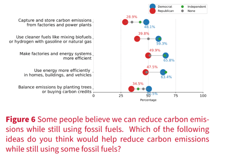 Overall, respondents showed stronger support for policies promoting energy efficiency — such as improving energy use in homes, vehicles, and factories — over more technical solutions like carbon capture. These solutions are seen as more effective and more likely to garner bipartisan support, the report states.