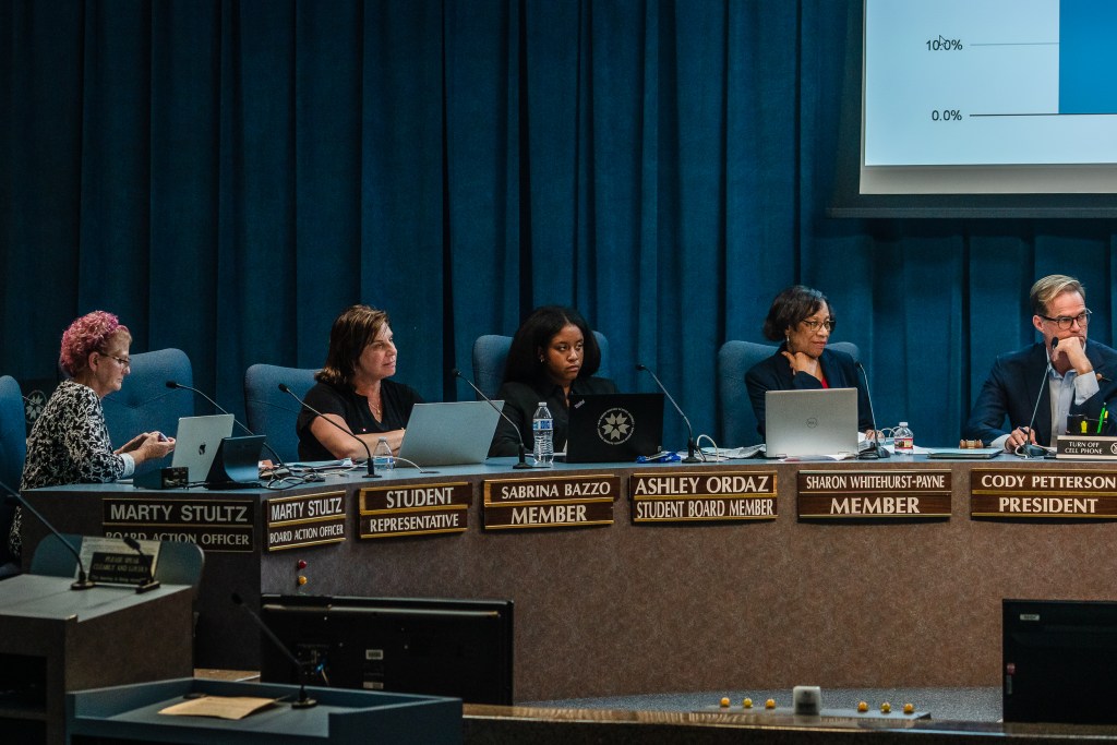 Board President Cody Petterson (right), Board Trustee Sharon Whitehurst-Payne (second from left), Student Board Member Ashley Ordaz (center), Board Trustee Sabrina Bazzo (second from left), and Board Action Officer Marty Stultz (left) during a San Diego Unified School District meeting on Sept. 30, 2025, in University Heights. / Ariana Drehsler for Voice of San Diego