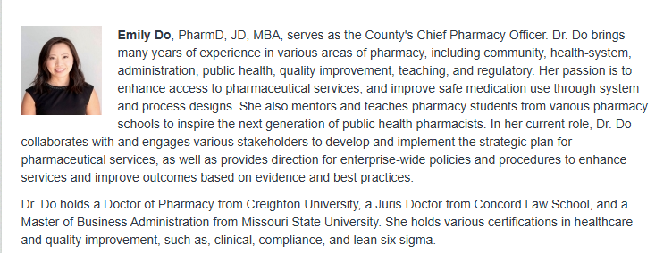 Dr. Emily Do is the county’s full-time chief pharmacy officer, who oversees county pharmacy practices and standards and has been in that role since 2019. In April, she joined the law firm Dilworth & Barrese as a partner and patent attorney, according to her LinkedIn profile.