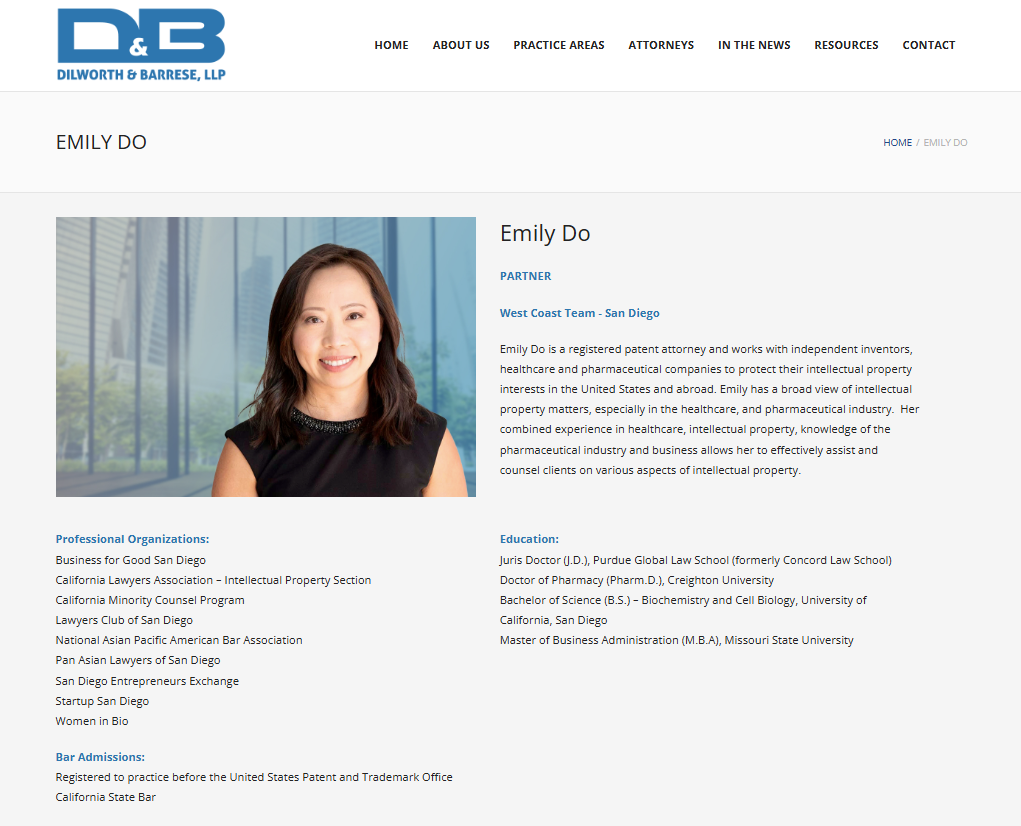 “Emily Do is a registered patent attorney and works with independent inventors, healthcare and pharmaceutical companies to protect their intellectual property interests in the United States and abroad,” her Dilworth & Barrese bio reads.