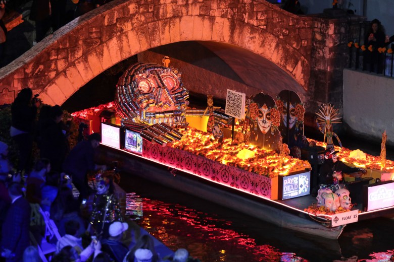 A float featuring the cempasúchil (Mexican marigolds) arrives to Arneson Theater during the first annual Day of the Dead San Antonio celebration and Catrina River Parade at Arneson River on Nov. 1, 2019. Credit: Scott Ball / San Antonio Report