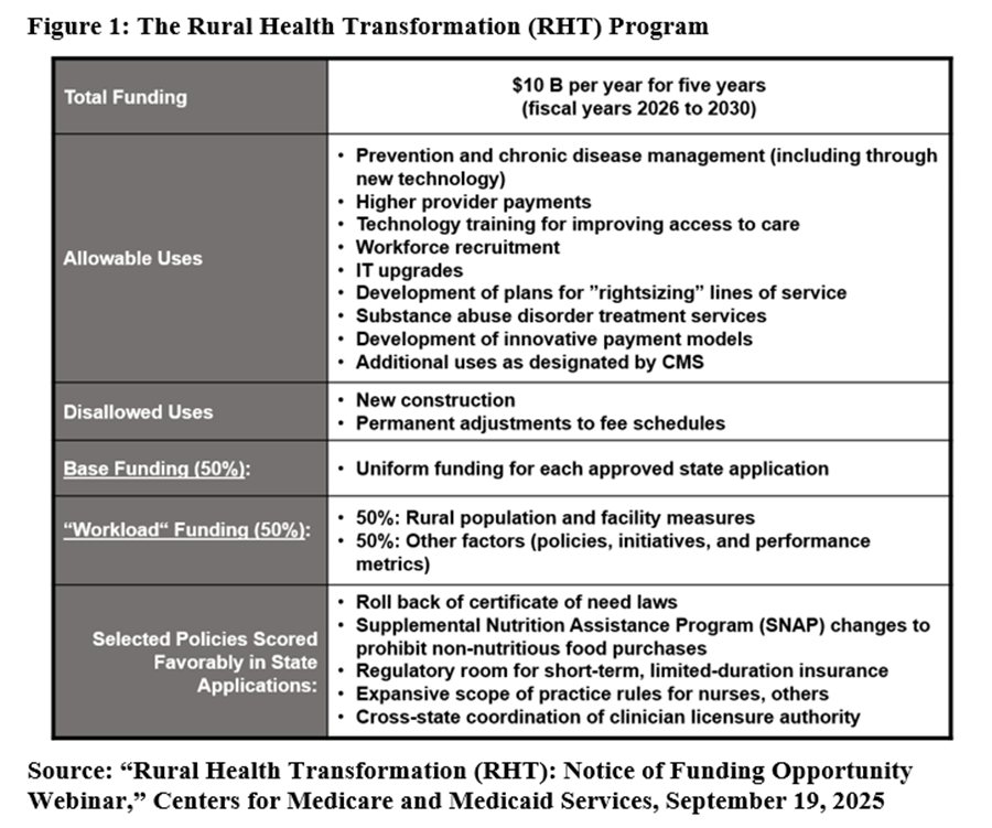 In September, the Centers for Medicare and Medicaid Services (CMS), which Congress charged with RHT administration, published its plans for accepting and reviewing state-initiated program applications. The guidance outlines the allowable uses of the funds and the scoring criteria for ranking state submissions. Figure 1 provides a summary of the program’s structure.