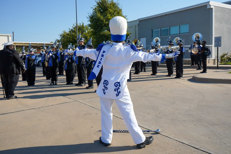 Dunbar High School marching band performs in the parking lot of the Tarrant County College Opportunity Center on Oct. 2, 2025. (Marissa Greene| Fort Worth Report)
