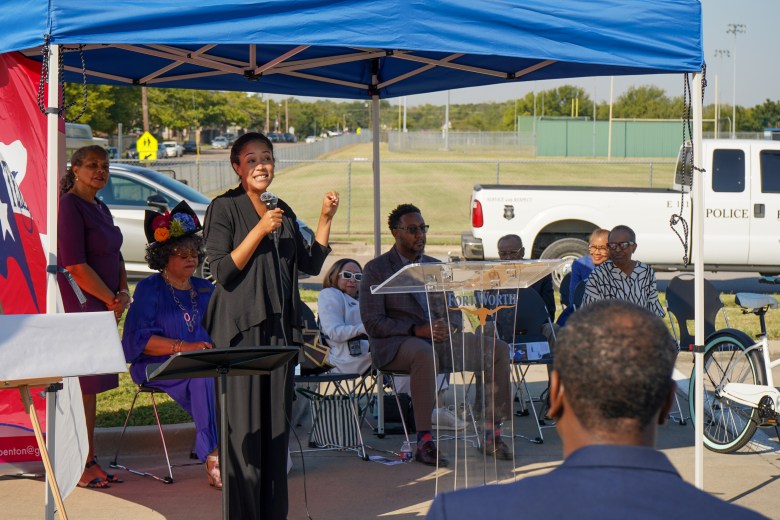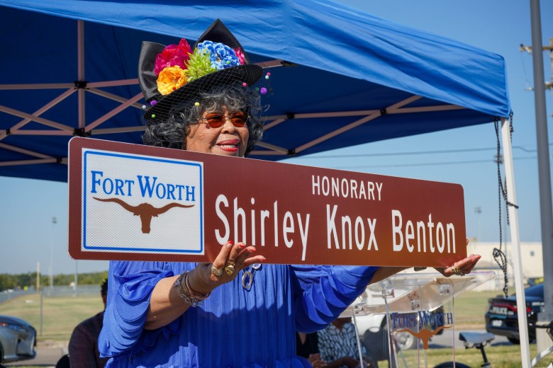 (Maria Crane | Fort Worth Report/CatchLight Local/Report for America)Shirley Knox Benton is honored with a street sign topper in Fort Worth on Oct. 2, 2025. (Maria Crane | Fort Worth Report/CatchLight Local/Report for America)