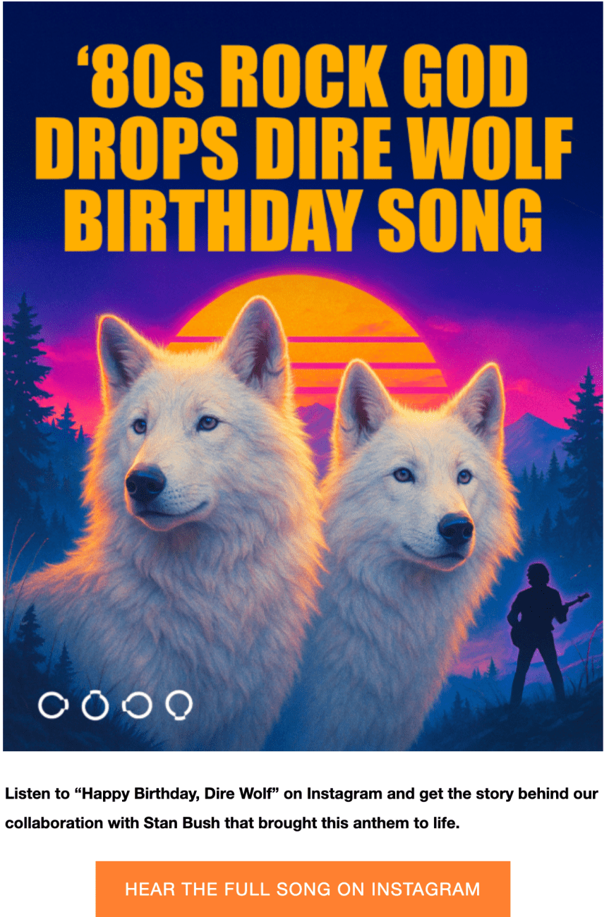 But I digress. Yesterday I got a puff email from Colossal celebrating the first birthday of two of the edited gray wolves, and the company is STILL calling them dire wolves. It even came with a special, albeit dreadful, birthday song. You must hear it! But first let’s see the email’s text, which I’ve pasted in below.