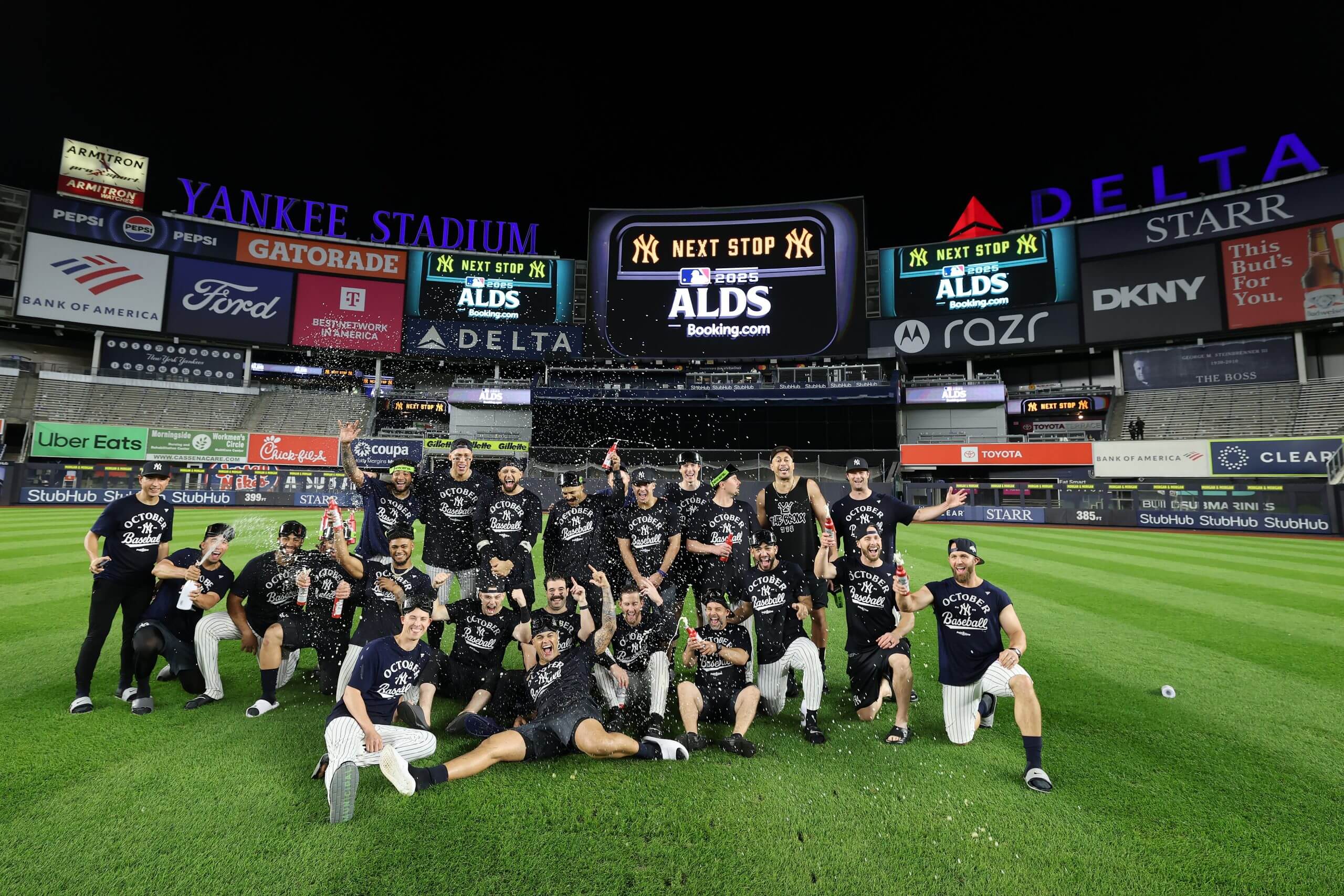 The Yankees pose for a team photo after beating the Red Sox to advance to the ALDS. Game 1 is Saturday in Toronto. (Al Bello / Getty Images)