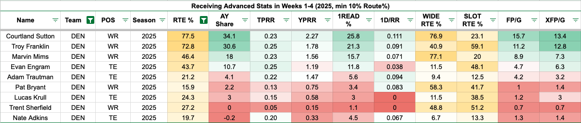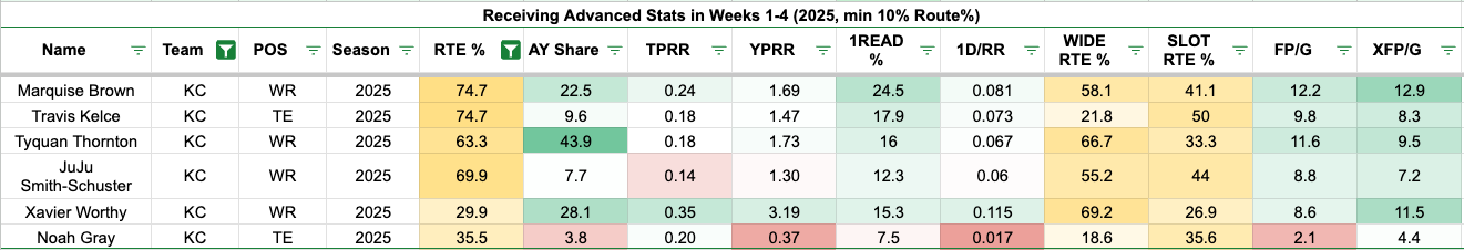 Worthy returned from a shoulder injury and showed us that the Chiefs need him in their offense. The Chiefs ranked 24th in EPA per dropback in Weeks 1-3, which jumped to 10th in Week 4. He leads the team with a 35 percent targets per route rate and 3.19 yards per route run. They like to involve him with some end-arounds, generating 38 rushing yards on three attempts in 2025.