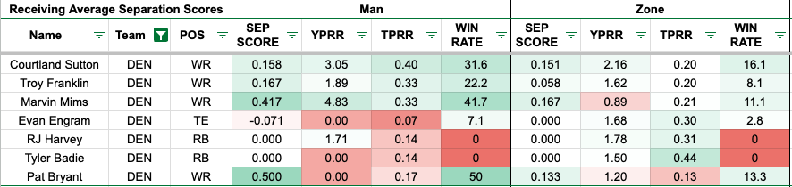Mims (25 percent, 3.75 yards per route) trails Courtland Sutton (47 percent, 4.07 yards per route) in target per route rate and yards per route run against Cover 1. There’s a higher probability that Sutton explodes in Week 5 while Mims remains a risky option. Mims has been used more on the outside on a per-route basis, and he projects to face Kelee Ringo, one of the Eagles’ outside cornerbacks.