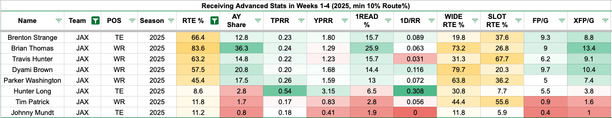 The Jaguars defense has been playing better than expected, but the opposite seems true for the offense. Thomas leads the team in air yards share, first-read target rate, and expected fantasy points. Besides Thomas, Brenton Strange and Travis Hunter have been trailing Thomas among their primary pass-catchers.