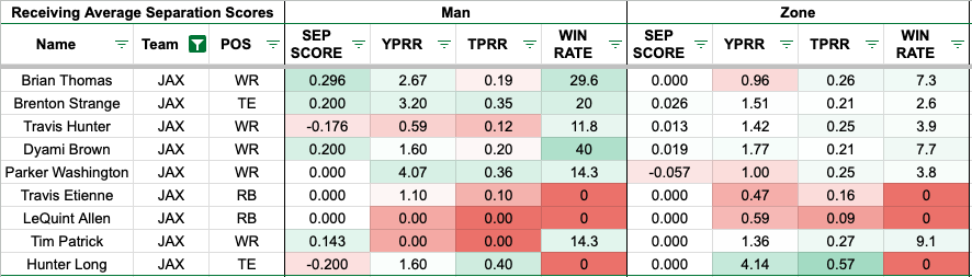 Worthy has been more productive (4.31) in yards per route run against man coverage compared to zone (1.56) in 2025, but he garners the highest target rate among their primary pass-catchers.