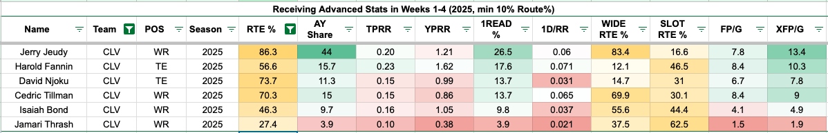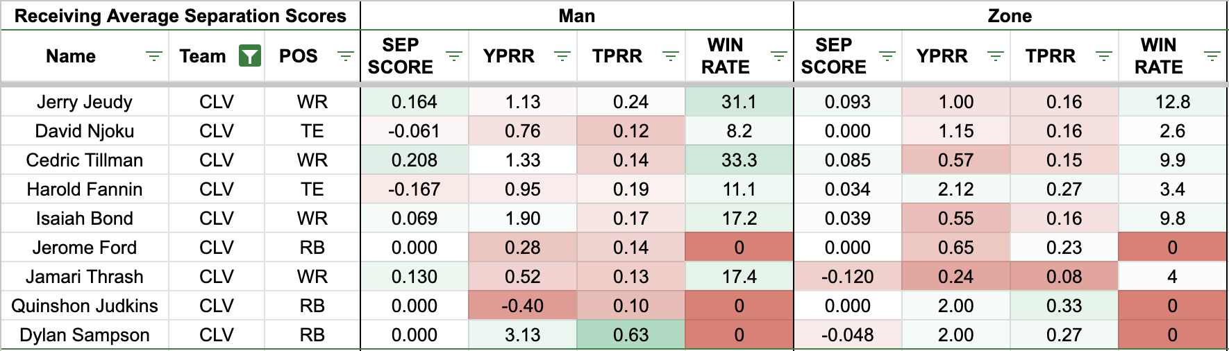 Jeudy has a mediocre 19 percent target rate and a team-high yards per route run (1.63) against two-high coverages. For context, only Fannin (1.24) and David Njoku (1.06) were the only other pass-catchers who produced over one yard per route against two-high in 2025.