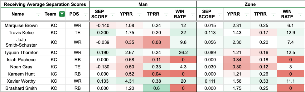 While Worthy’s skill set might not be made to pop off against the Jaguars’ coverage tendencies, he should find success as the Chiefs’ top receiver if Smith-Schuster and Brown were fairly productive on a per-route basis against two-high looks.