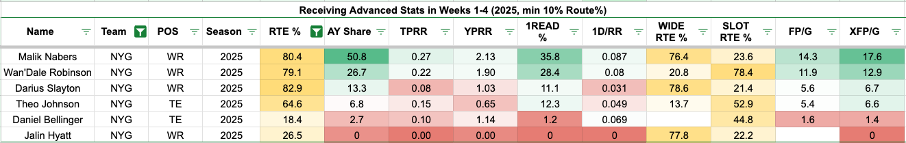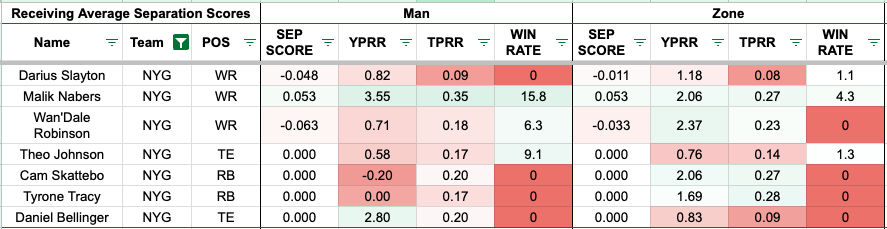 Robinson garners the second-highest target rate (27 percent) and the third-most yards per route run (1.57) among the Giants receivers against Cover 3. He trailed Nabers in target rate (32 percent), but Slayton leads the team in yards per route run (2.90) compared to Nabers (2.32) against Cover 3 in 2025.