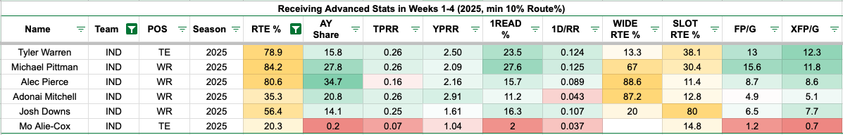 Tyler Warren has been pushing the Colts’ team lead for the highest target rate (26 percent) while running routes at nearly 80 percent of the dropbacks. That’s wide receiver-type usage for Warren, leading to Downs losing routes and first-read targets, so this might be somewhat of a risky play to roll out the Colts slot receiver in Week 5.