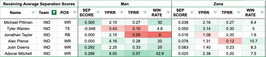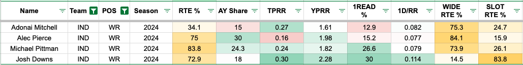 For context, Downs ran a route on 72.9 percent of the dropbacks with a team-high 30 percent first-read target share in 2024. Michael Pittman Jr. was the primary source of competition, with Alec Pierce being the other primary outside receiver last season, as seen below.