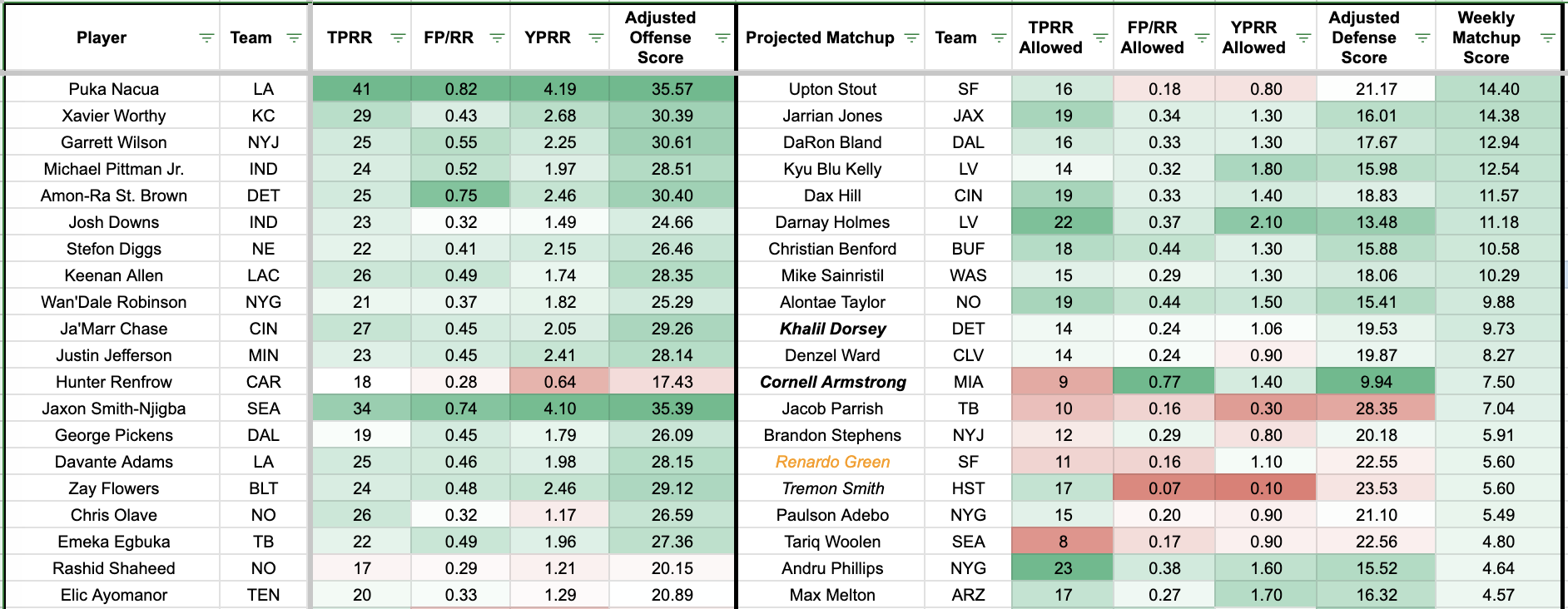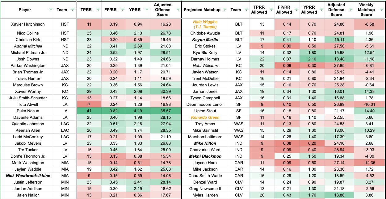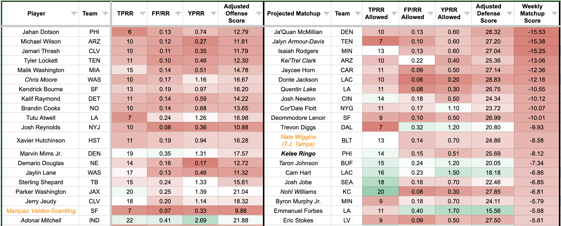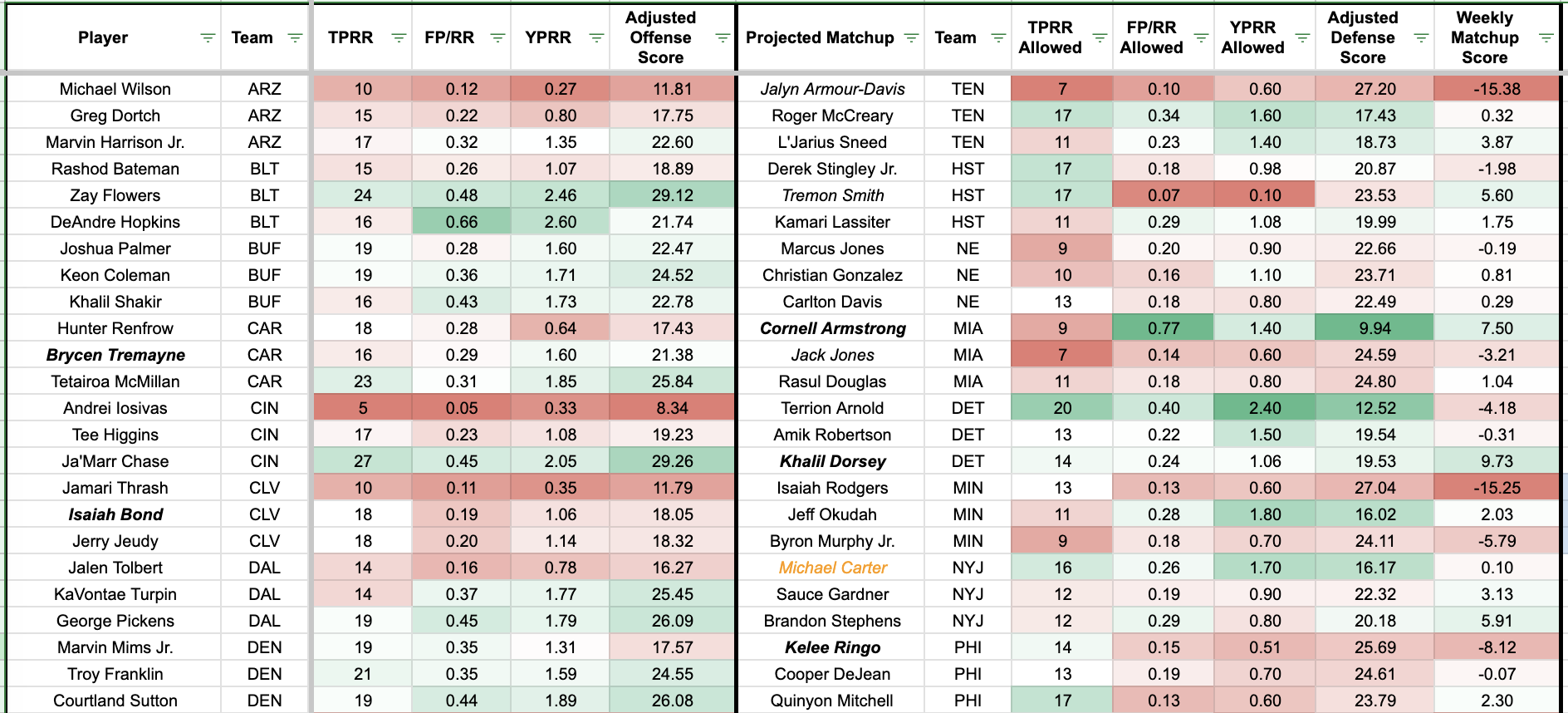 One way to use this chart is to identify weaker or tougher projected matchups in the given week. Another purpose involves identifying which team-level matchups to target. For instance, if multiple receivers have a positive or green matchup score on the same team, that indicates the opposing secondary could be a favorable matchup.