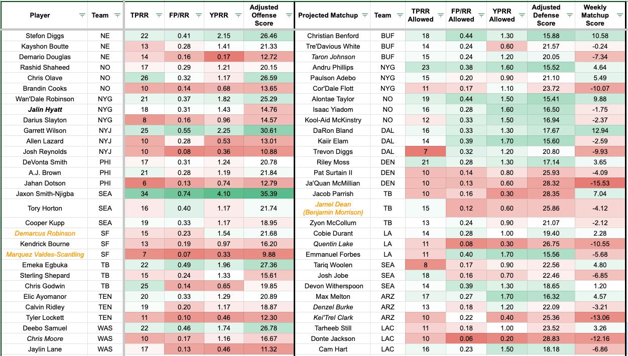 Most teams mix in defensive backs all over the field, with very few cornerbacks shadowing an opposing top receiver. The main takeaway involves not overreacting to a weaker matchup if the receiver is a high-end to near-elite target earner and producer in their respective offense. Based on the weekly matchups, we’ll use various tools to find several matchup upgrades and downgrades for the opposing receivers.