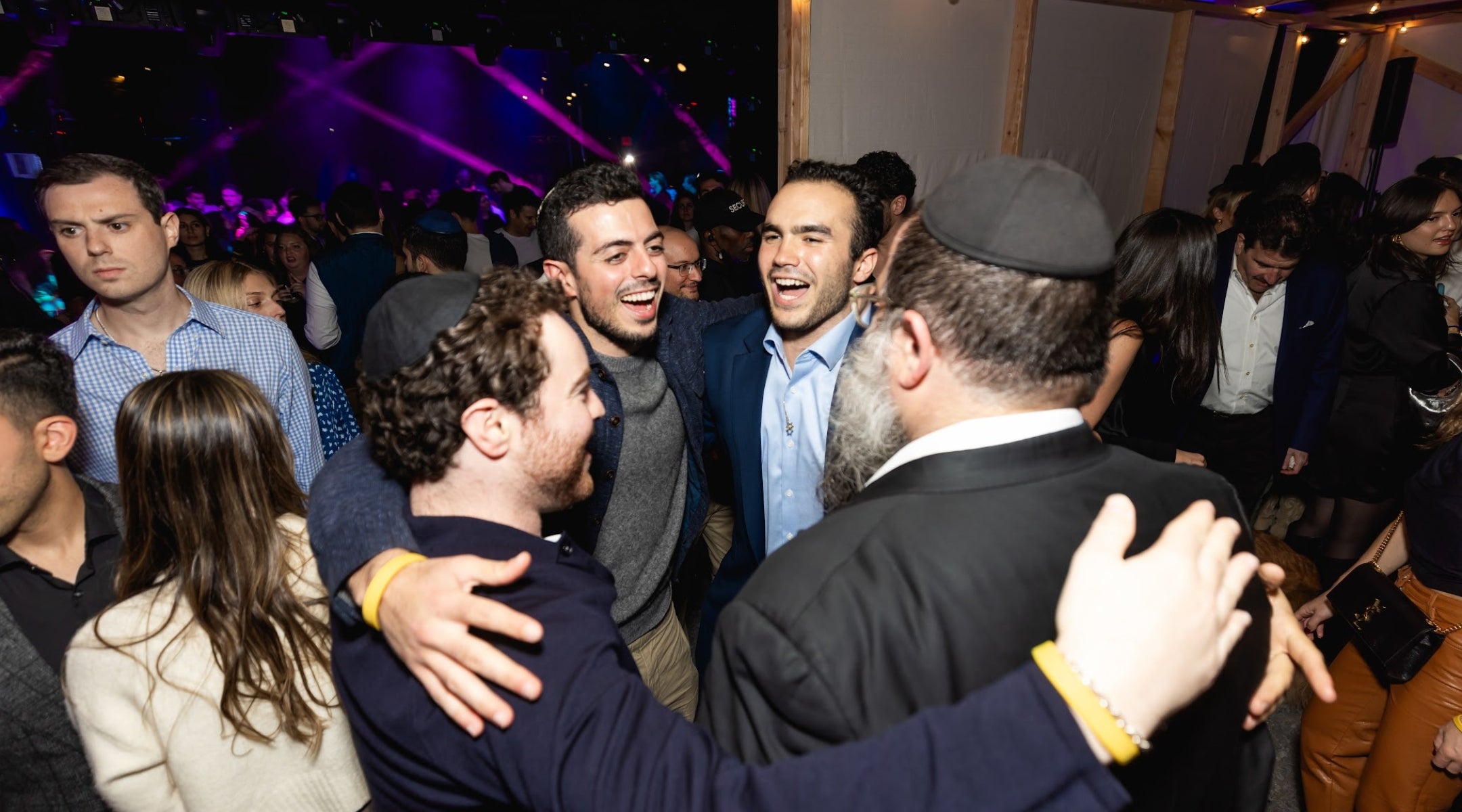 A group of men dance together in the sukkah at Sukkot 3000 in October, 2024. (Samii Stoloff Photography)