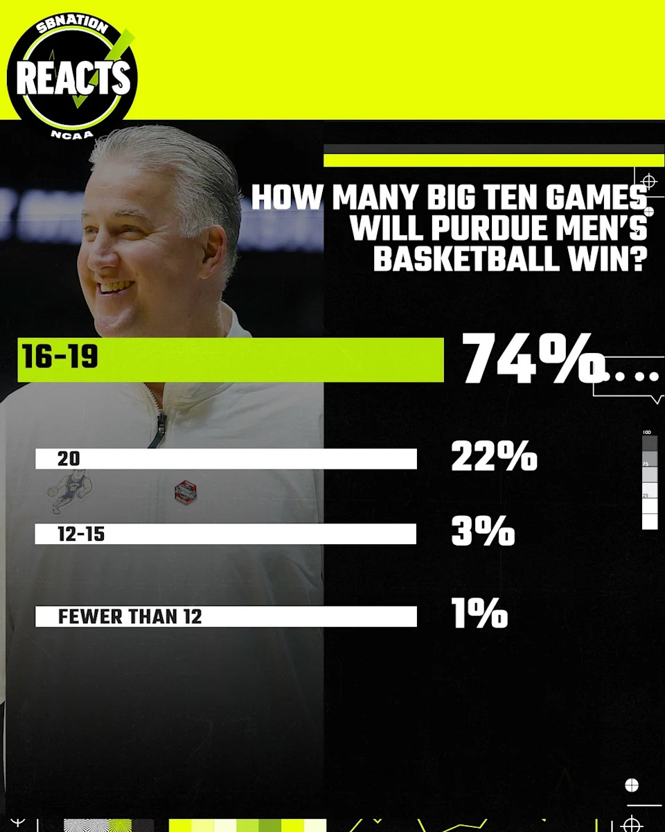 An incredible 22% of fans think that Purdue will do something that has never been done and win all 20 of their conference games this season. No Big Ten team has finished with more than 17 wins in this 20 game era. It would be truly incredible if Purdue did that. Next up though was 16-19 games with 74%. That win total would almost assuredly result in Purdue winning the conference.