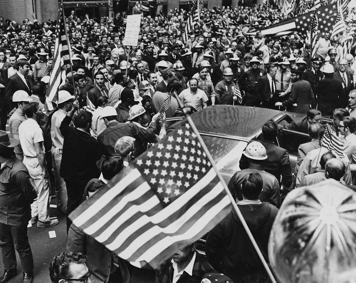During the protest, a large group of construction workers, busy building the World Trade Center just a few blocks away, marched toward the antiwar crowd. The workers wore their hardhats and carried American flags. They also brought a deep well of anger and resentment toward the young demonstrators. A riot ensued, as construction workers smashed their way through the protest crowd. The flag-waving hard hats managed to take control of the steps of Federal Hall.