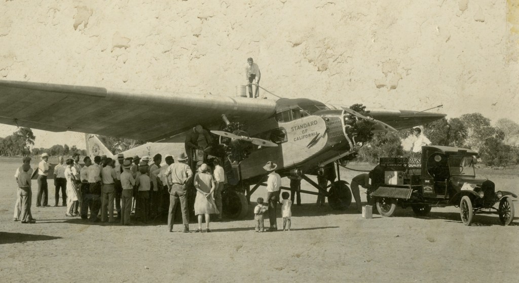 A Ford Tri-Motor airplace owned by the Standard Oil Company at Phoenix Sky Harbor in the late 1920s.