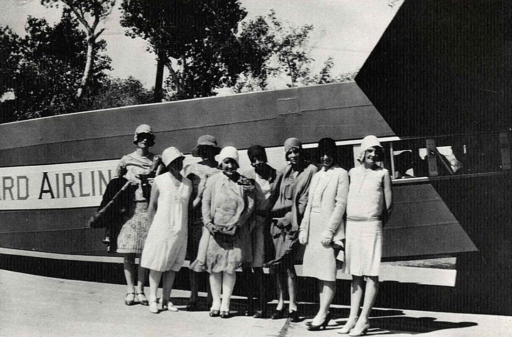 A group of female passengers next to their Standard Airlines Fokker Tri-motor airplane during a stopover at Sky Harbor in the 1920s.
