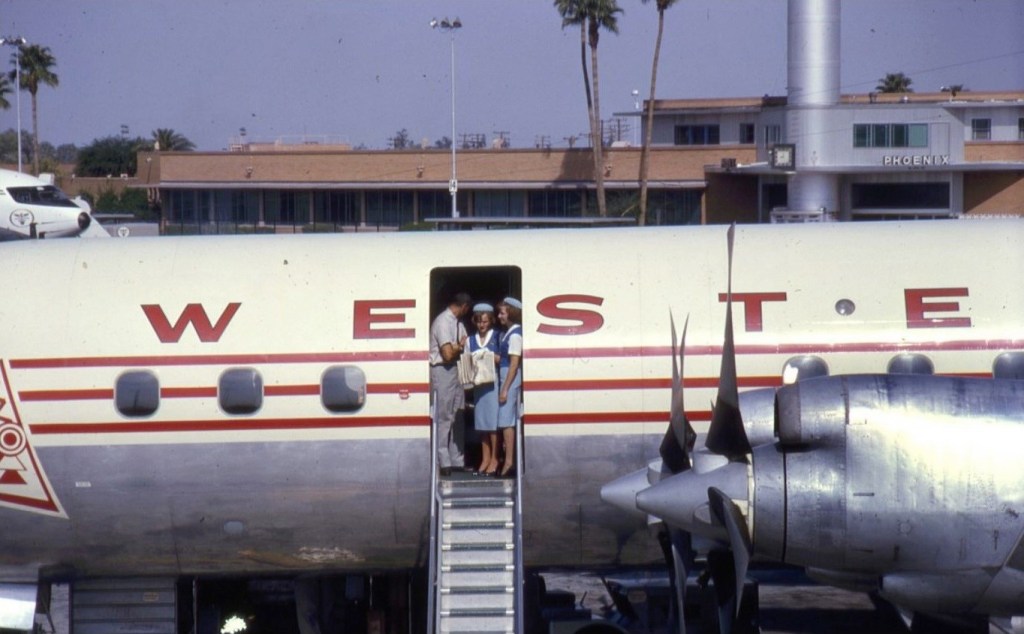 Flight attendants chat with a passenger aboard a Western Airlines plane at Sky Harbor in 1964.