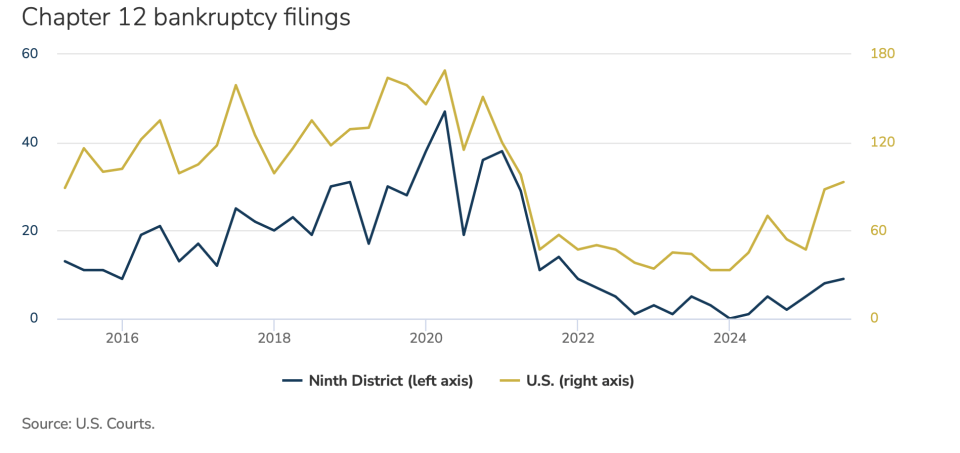 To be sure, the recent spike in bankruptcies doesn’t mean farmers are going out of business, the Minneapolis Fed pointed out. A Chapter 12 filing can help them avoid total liquidation and allow them to continue operating, perhaps on a smaller scale after some restructuring.