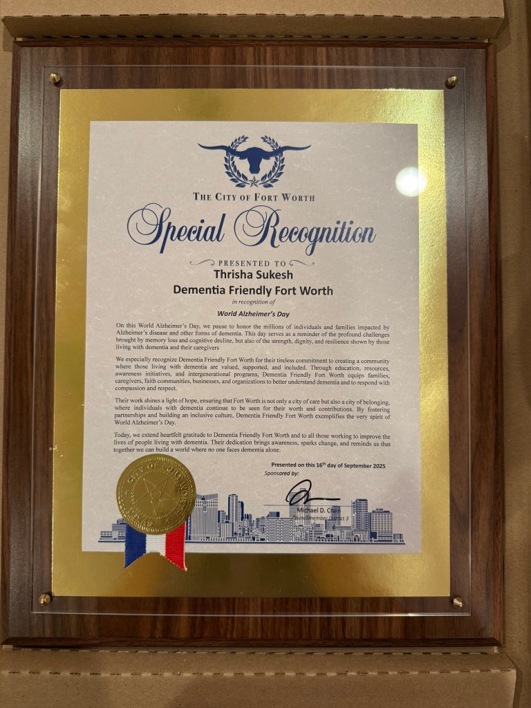 “Thrisha Sukesh’s leadership and passion for making Fort Worth a more dementia-friendly community are truly inspiring; her advocacy and ability to mobilize fellow students show what happens when compassion and action come together,” he said.