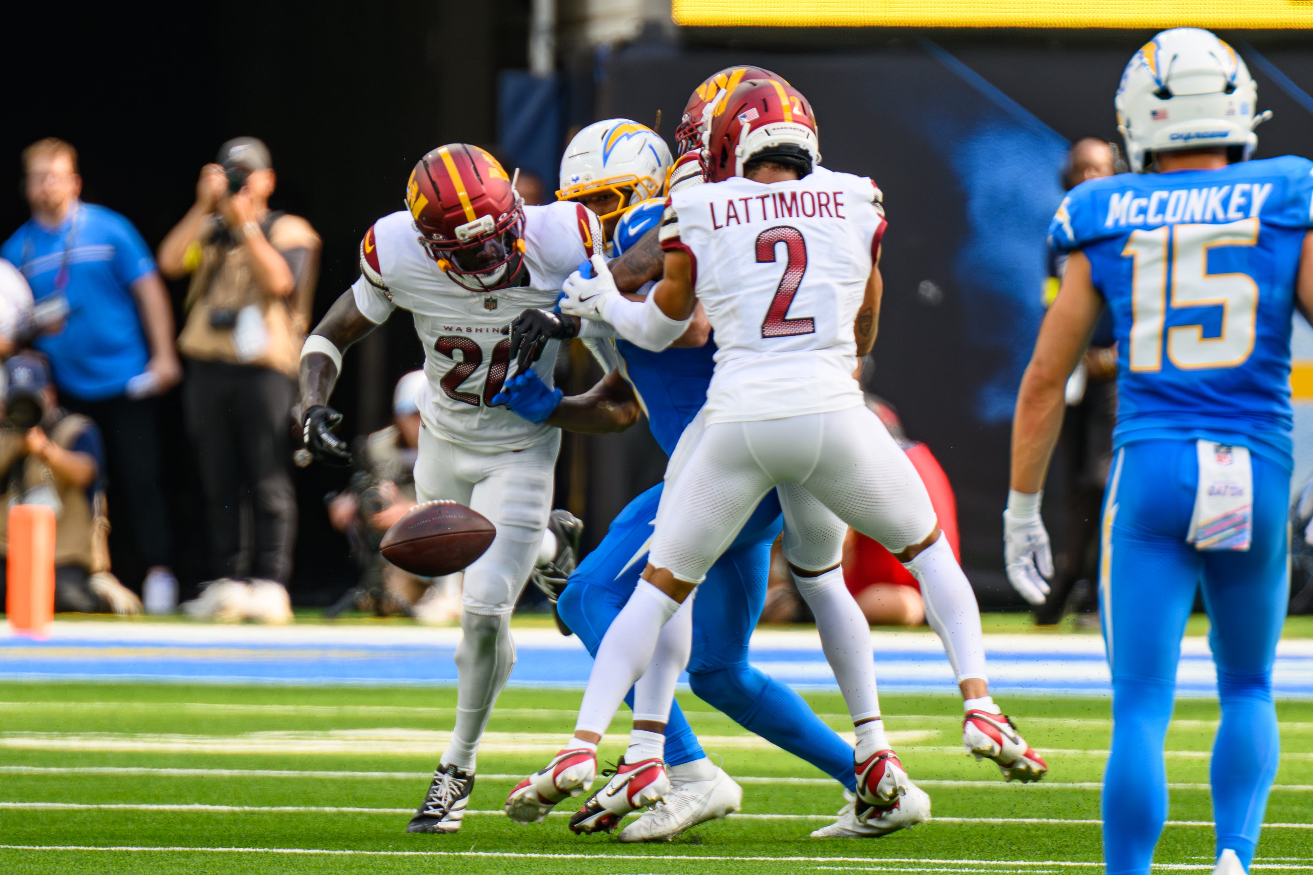 Quan Martin forces a fumble in the Commanders’ win over the Chargers; courtesy of All Pro Reels