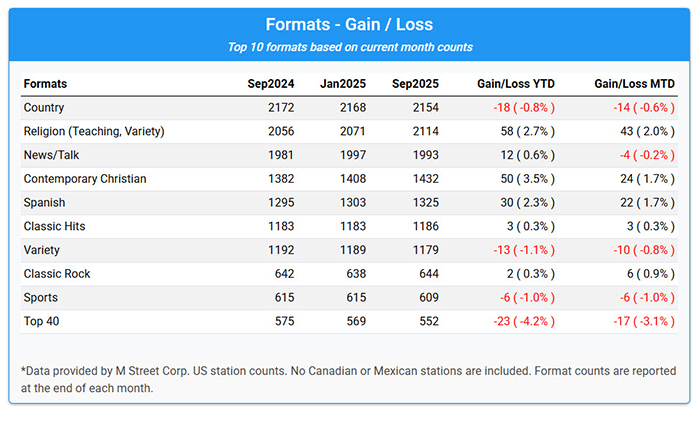 While contemporary Christian added stations every month for the past year, the 10th-ranked top 40 has trimmed its roster, down 23 stations without a gain during any of the past 12 months, with its total off by 4.2% year-over-year and 3.1% for 2025-to-date.