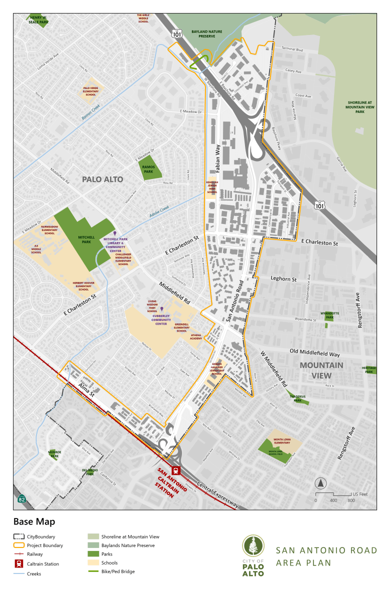 This map shows the boundaries of the San Antonio Road planning area. Courtesy city of Palo Alto
