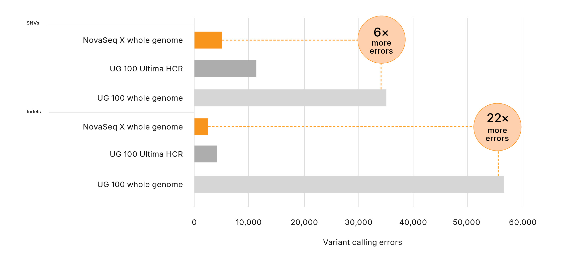 Figure 2: Significantly more errors in variant calling with Ultima Genomics─The UG 100 platform produces 6× and 22× more errors in variant calling for SNVs and indels, respectively, compared to the NovaSeq X Series, assessed against NIST v4.2.1 all benchmark regions. Errors are defined as the combined number of false positives and false negatives.